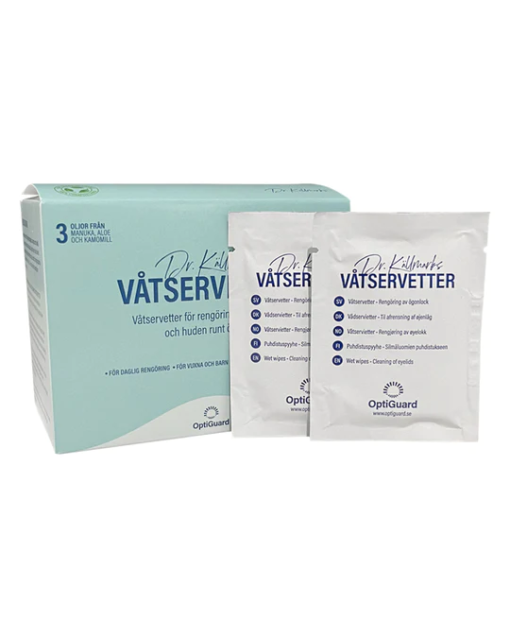 Dr. Källmarks Våtservetter för ögonen är speciellt utvecklade och framtagna för att rengöra ögonlocken från smuts, pollen, och sekret som kan orsaka ögonallergi eller infektion. Även för inflammation eller infektion i ögonlocken, såsom blefarit, dysfunktion i Meiboms körtlar eller vaglar som kan leda till torra ögonsymtom.