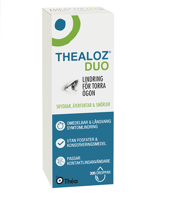 Thealoz Duo är de enda ögondropparna som innehåller en kombination av cellskyddande trehalos och återfuktande hyaluronsyra. Inspirationen kommer från naturen och är ett nytt mycket effektiv sätt att behandla torra ögon. Thealoz Duo fungerar oavsett om du har milda, medelsvåra eller svåra problem av torra ögon. Anledningen är att oavsett svårighetsgrad har du med torra ögon nytta av både återfuktning och cellskydd.